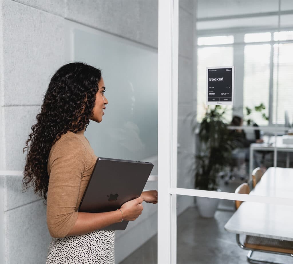 • Rezervacija sob in prostorov (Room Booking): Popolna sinhronizacija z vašimi koledarji (Google, Outlook, Office 365). Omogoča vam takojšen pregled zasedenosti, preprečuje podvajanje rezervacij in avtomatsko sprošča sobe, če se sestanek ne zgodi (“ghost meetings”).